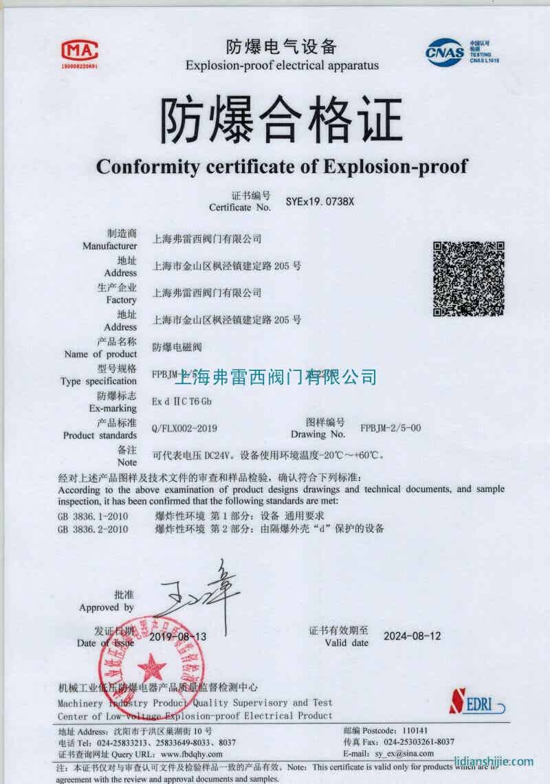 弗雷西防爆電磁閥獲得防爆認證