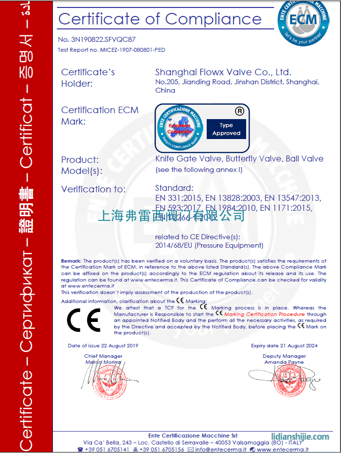 弗雷西蝶閥,球閥,插板閥獲得意大利ECM的ce認證,