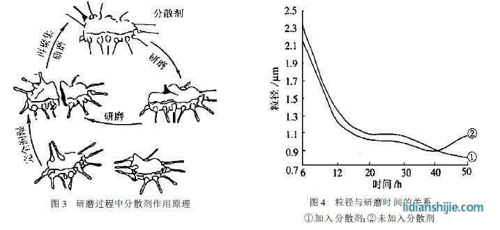 1 .1 分散劑的助磨作用 原料粉碎是陶瓷制備過程中的一個重要環節, 而其中濕磨法又是行之有效的方法之一, 在濕法球磨中, 由于分子或粒子的相互撞擊、靠近、吸引, 粉料往往會產生團聚.特別是研磨到一定時間后, 還有可能出現一個問題即“逆研磨”現象[ 4] .即在粉碎時, 當物料達到一定細度時, 如果繼續下去, 就會出現粒度不會越來越細反而越來越粗的現象.為此人們進行了大量的實驗研究 .發現加入分散劑后, 由于其靜電穩定及空間穩定機制, 能有效打碎粉料中的弱團聚(見圖3), 獲得粒度更細, 直至亞微米級的粉料, 而且粉料粒度分布均勻, 粒形更接近于球形.這樣可以提高研磨效率, 節約能耗.從圖4 我們可以看到, 加了分散劑的試樣尚未發生逆研磨, 而且極限粒徑要小于未加入分散劑的試樣.圖3 研磨過程中分散劑作用原理圖4 粒徑與研磨時間的關系①加入分散劑;②未加入分散劑