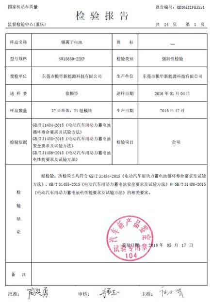 動力電芯產品已通過GB/T 31484、GB/T 31485、GB/T 31486、UL1642、UN38.3、QC/T 743、RoHS、REACH認證