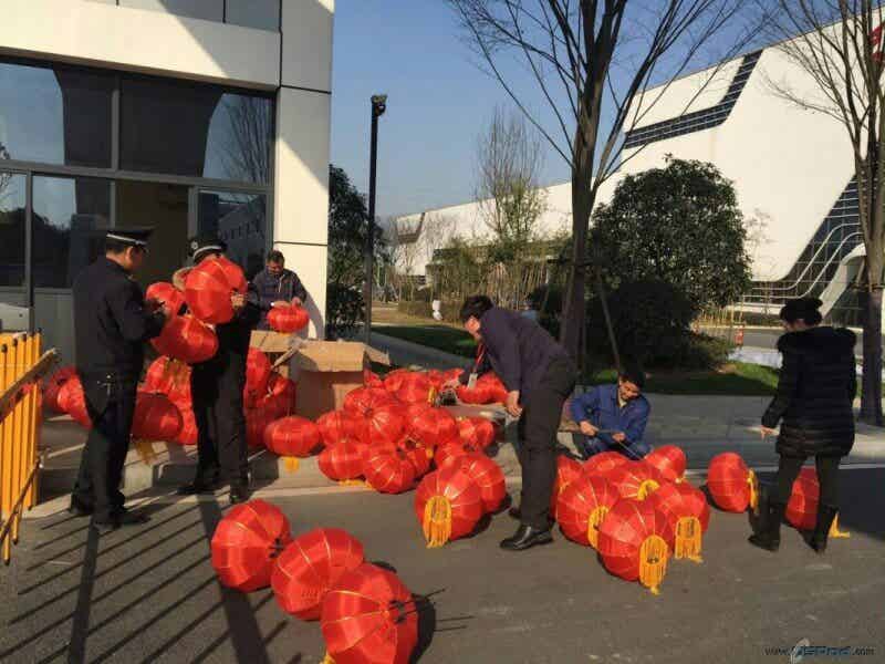 圖為公司員工在懸掛大紅燈籠,迎接紅紅火火的新一年。
