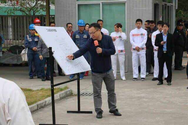 張良均總監向中山市消防局一行詳細介紹公司消防平面圖及講解鋰離子電池生產工藝流程。