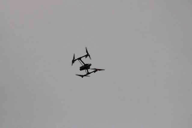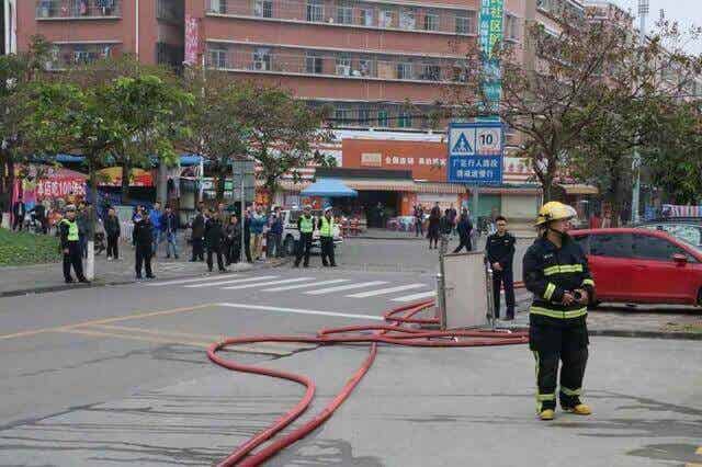 運用無人機探測發生事故區域,趕到現場的消防員們先迅速拉好警戒線,然后用水管不斷向模擬發生事故的區域沖水。
