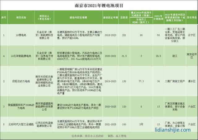 近日,南京市發布2021年經濟社會發展重大項目計劃,5個鋰電池項目在列,建設主體包括LG化學、欣旺達、榮盛盟固利、云彩時代。