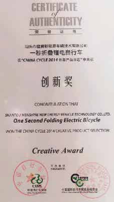 日前,由中國自行車協會、中國國際自行車展覽會組委會主辦的“CHINA CYCLE2014創新產品評選活動”經專家評委歷經一個半月的評選,最終結果已出爐,猛獅科技旗下猛獅新能源車輛技術有限公司最新推出的一秒折疊鋰電自行車榮獲“CHINA CYCLE2014創新獎”。