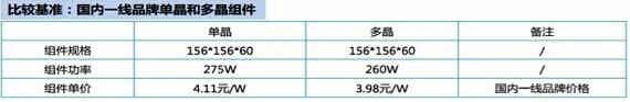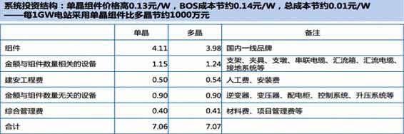 單晶硅與多晶硅是太陽能光伏晶硅組件的兩條技術路線,因晶格排列不同而區分為單晶、多晶。業內普遍的觀點認為,單晶硅具有發電量高的優勢,但成本偏高。然而,最新的數據顯示,兩者的電站綜合建造成本幾乎持平,并且,在后期運維方面,單晶硅具有一定優勢。