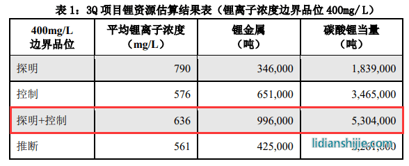公告顯示,根據(jù)Neo Lithium在今年6月更新的評(píng)估報(bào)告,3Q項(xiàng)目碳酸鋰當(dāng)量總資源量約 756.5萬(wàn)噸,其中,探明+控制級(jí)碳酸鋰當(dāng)量資源量為530.4萬(wàn)噸,平均鋰離子濃度為636mg/L。