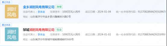 企查查官網顯示,1月4日,金鄉潤時風電有限公司成立,1月3日,鄒城潤時風電有限公司成立。兩家公司的注冊資本均為1000萬元,法定代表人為李吉金,兩家公司由寧德時代全資子公司時代綠色能源有限公司等共同持股。