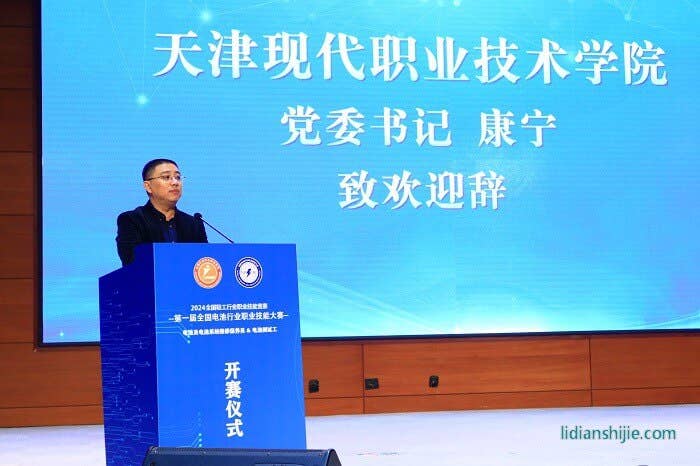 天津現代職業技術學院黨委書記康寧在致辭中對各位嘉賓的到來表示熱烈歡迎,并強調學院深入貫徹落實習近平總書記對技能人才工作的系列重要指示和全國教育大會精神,大力弘揚勞模精神、勞動精神、工匠精神,加強儲能材料技術專業建設,矢志為中國式現代化培養更多電池行業大國工匠、能工巧匠和高技能人才。