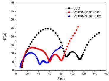 將上述三種材料在常溫下循環5周后進行交流阻抗測試,其測試結果如圖5所示。不難看出,三種樣品的Nyquist曲線由三部分組成,其中在低頻區的直線或斜線代表的是材料的Warburg阻抗,它代表鋰離子的固態擴散;中頻區的半圓代表的是電荷轉移過程中形成的阻抗;而高頻區的半圓為鋰離子通過電極表面與電解液極化反應形成的SEI膜的阻抗,半圓越小代表Li+和電子在遷移過程中,所受到的阻力越小。從圖5中不難看出材料具有三種材料LCO,LiCo0.96Mg0.01V0.03O1.99F0.01和LiCo0.95Mg0.02V0.03O1.98F0.02的電荷轉移阻抗(第二個半圓右側最低點所在的位置)分別為113Ω, 80.6Ω,54.5Ω,其中LiCo0.95Mg0.02V0.03O1.98F0.02具有最小的電荷轉移阻抗,這也和該材料表現出最好的比容量和最好的循環性能完全相一致。