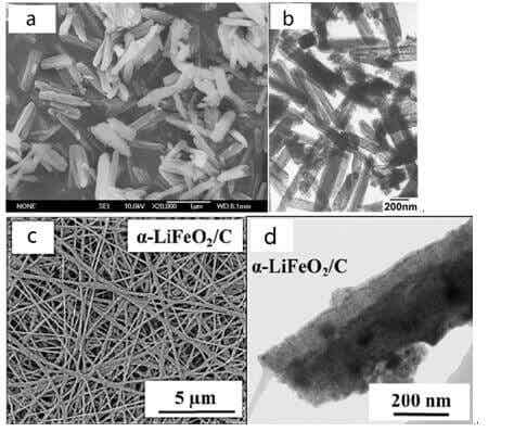 2ab)分別為LiFeO2納米棒的FESEMTEM[12];(ce)分別為中空α-LiFeO2和α-LiFeO2/C的SEM[23];(df)分別為中空α-LiFeO2和α-LiFeO2/C的HRTEM[23]