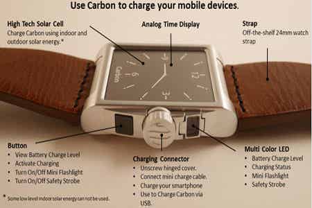 Carbon是一款與眾不同的智能手表,與其他產(chǎn)品不同的是,它還可以為你的智能手機(jī)充電。它內(nèi)置了一個太陽能充電板和800毫安時的電池,可以在室外及擁有自然光照的室內(nèi)吸收太陽能。當(dāng)你的智能手機(jī)沒電時,Carbon可以用來應(yīng)急充電,當(dāng)然不能把手機(jī)充滿。