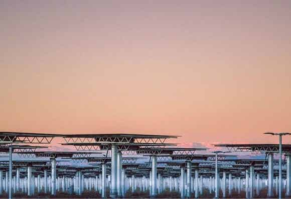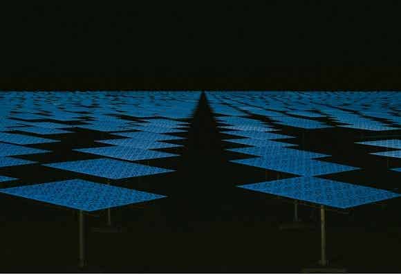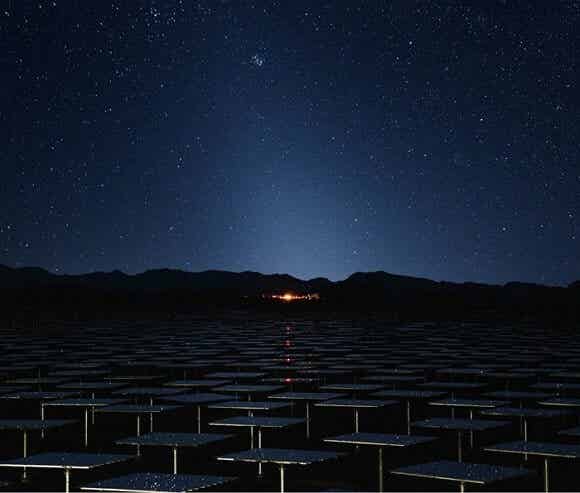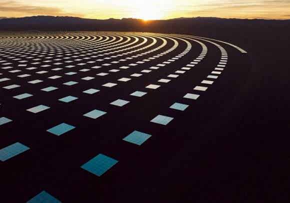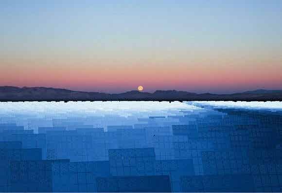 從飛經內華達上空的飛機往下看,新月沙丘(Crescent Dunes)光熱電站就像是在地表上的一道明亮閃光。你只有在地表上看才會了解到它是多么的龐大:近675.8公頃的沙漠被10347個公告牌大小的定日鏡所覆蓋,這個發電站所提供的電量足以支撐75000所家庭。
