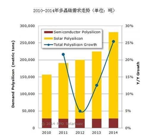 鋰電世界 根據(jù)最新NPD Solarbuzz多晶硅和硅片供應(yīng)鏈季度報(bào)告Polysilicon and Wafer Supply Chain Quarterly顯示,2014年太陽能和半導(dǎo)體級(jí)多晶硅需求預(yù)計(jì)將大幅上漲至282,000噸,比去年增加25%。多晶硅需求大幅上漲的主要原因是終端市場光伏組件出貨量的增加,2014年太陽能光伏組件出貨量預(yù)計(jì)將達(dá)到近49GW。
