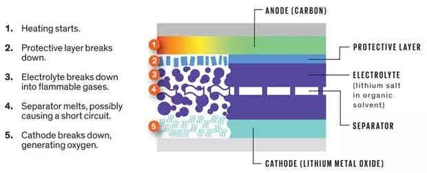 1.熱量產(chǎn)生;2.保護層破壞;3. 電解液分解成易燃氣體;4.隔膜熔化,可能造成短路;5.陰極破壞,產(chǎn)生氧 圖片來源:llustration