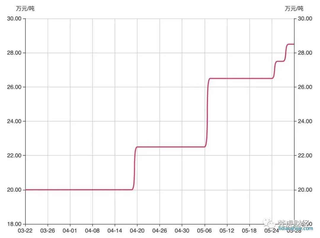 作為鋰電池電解液的關鍵材料,去年下半年以來,六氟磷酸鋰價格重心不斷上移。數據顯示,截至5月28日,六氟磷酸鋰報價為28.5萬元/噸,近兩個月累計上漲超42%。
