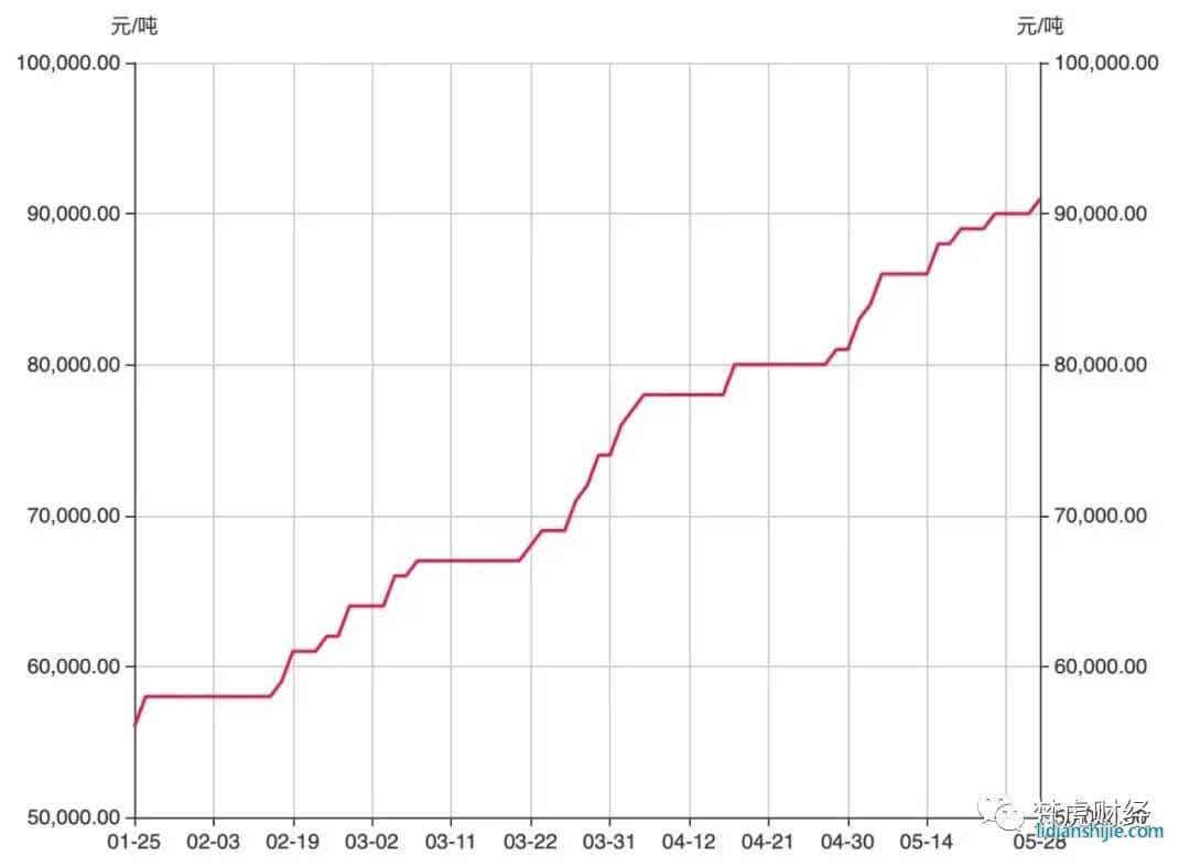 鋰電池全產業鏈的火爆,也為上游原材料提供強勁的價格上漲動力。例如,作為高鎳三元鋰電池的關鍵原材料,氫氧化鋰價格已連漲23周。數據顯示,截至5月28日,國產氫氧化鋰報價為9.1萬元/噸,今年以來累計漲幅達85%。