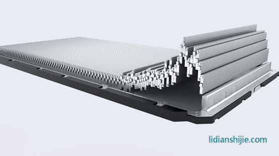 比亞迪刀片電池自身的強度來實現(xiàn)自我支撐,同時再依靠集成后的電芯強度來增加整個電池包的結構強度,100個刀片電池組成的電池排布在一起,并且上下兩面各加一塊高強度蜂窩鋁板,組成類蜂窩鋁三明治穩(wěn)定結構。
