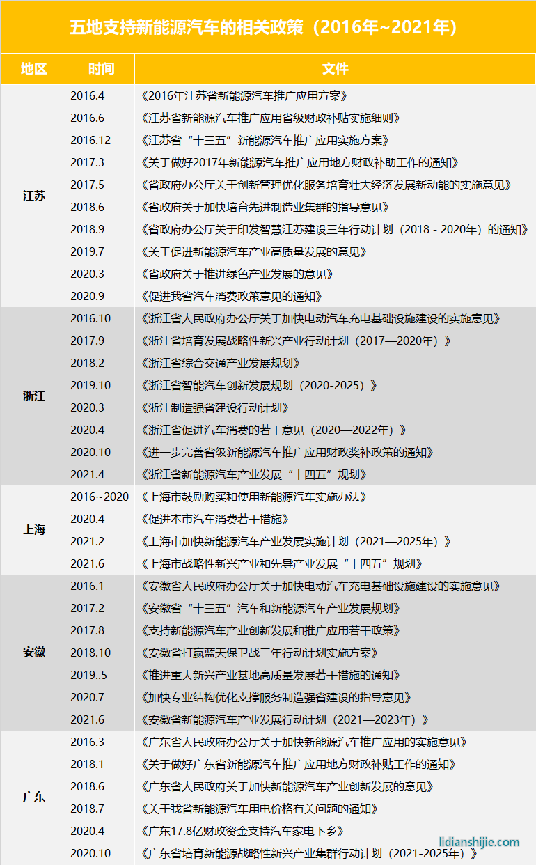 2016年到2021年,5地支持新能源汽車的部分省級文件 | 放大燈團隊制圖