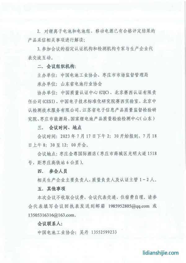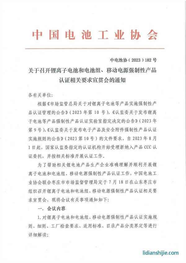 關于召開鋰離子電池和電池組、移動電源強制性產品認證相關要求宣貫會的通知 2023-07-05 822290 核心提示:下載附件:參會回執表.docx作者:中國電池工業協會 下載附件: 參會回執表.docx 作者:中國電池工業協會 點贊 0舉報收藏 0打賞 0評論 0分享 107 更多>同類鋰電資訊 • 容誠電子落地濟源 萬洋拓展鋰電領域新布局 • 資源稅對鋰礦成本的影響 • 美國轉向油車開始取消亞洲鋰電池訂單,美股鋰電 • 鋰電池打響漲價“第一槍”,德加能源電池系列價 • 感覺未來主流會是大電池增程 • 德方納米榮獲2025年度正極材料優質供應商稱號 • 奔馳正加速推進電動車固態電池上車進程 • 磷酸鐵鋰電池漸成市場主力 • 迷之碳酸鋰庫存 • 鋰電產業鏈周記 | 寧德時代聯手五大車企發布10