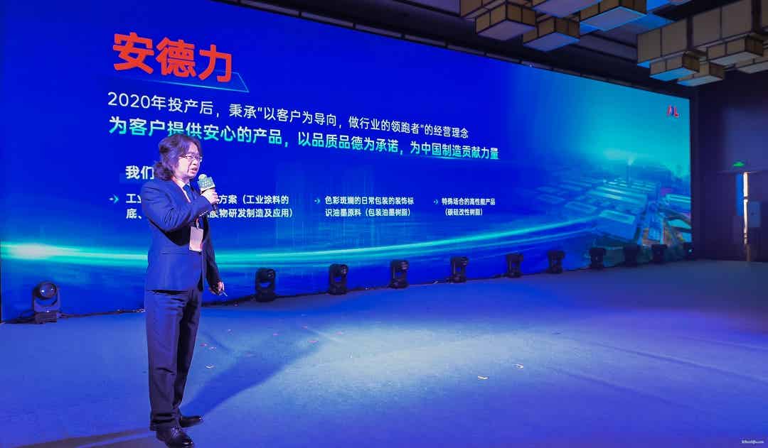 江西安德力高新科技有限公司副總經(jīng)理王立峰先生,介紹了安德力在環(huán)保油墨樹脂、水性工業(yè)涂料樹脂、碳硅改性材料的性能及應(yīng)用,為多個(gè)行業(yè)提供了綠色、高效的應(yīng)用解決方案。