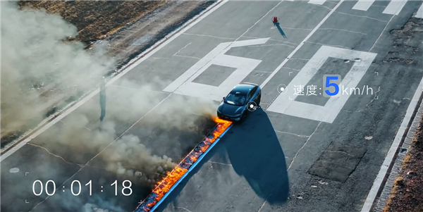 第二項(xiàng)測(cè)試兇險(xiǎn)非常,需要將整輛車開到一條長(zhǎng)長(zhǎng)的“火路”上,車輛以5km/h的速度前進(jìn),由炙熱的明火直接燒烤電池包長(zhǎng)達(dá)1分多鐘。