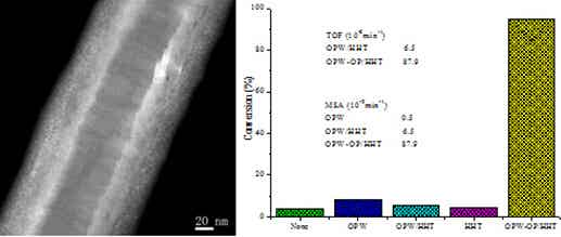 圖2. 左圖:OPW-OP/HHT復合材料的HAADF-STEM圖像;右圖:不同催化劑材料在DBT氧化過程中的催化活性