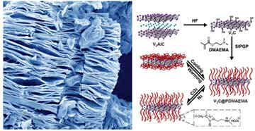 V2CTx屬于MXenes材料中的一種典型二維材料,其晶格常數(shù)c值的增加(V2AlC的c值為13.83 Å,V2CTx的c值為19.73 Å 或 23.96 Å)是目前已知的MXenes中最大的,因此V2CTx層間能夠容納更多更大的離子或分子。比如作為鋰離子電池的電極材料,V2CTx在充放電速率為1C和10C時(shí),電容量分別高達(dá)280mAhg-1和125mAhg-1,這在所有已知的Mxenes中是最優(yōu)異的。考慮到有機(jī)材料的智能響應(yīng)性,導(dǎo)電型MXenes無機(jī)材料與有機(jī)材料雜化將開拓更廣闊的應(yīng)用空間。多重刺激響應(yīng)高分子因其在復(fù)雜環(huán)境中能對(duì)兩種或者更多的外界條件做到協(xié)同可控響應(yīng)而受到越來越多的關(guān)注。