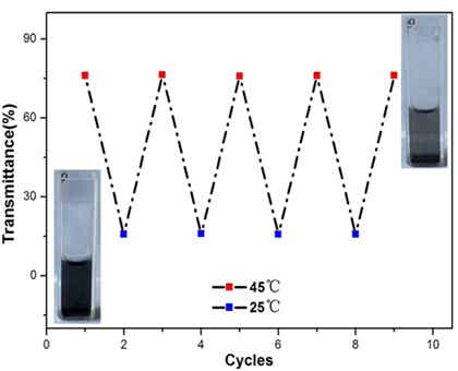 中國科學(xué)院寧波材料技術(shù)與工程研究所結(jié)構(gòu)與功能一體化團(tuán)隊(duì)與智能高分子材料團(tuán)隊(duì)合作,將V2C與具有某些特殊基團(tuán)高分子PDMAEMA復(fù)合獲得了一種CO2-溫度雙重響應(yīng)的智能材料(如圖1)。這種V2C@PDMAEMA復(fù)合材料的水溶液存在一個(gè)低臨界溶液溫度(LCST),因此溶液的透光率能夠隨著溫度的交替變化發(fā)生可逆變化(如圖2)。表現(xiàn)為25℃時(shí)溶液透光率很低,這是由于復(fù)合材料中的高分子該狀態(tài)下處于相對(duì)舒展的形態(tài),使得V2C@PDMAEMA能夠良好地分散在水中;而45℃時(shí)高分子會(huì)發(fā)生收縮,并與V2C形成非水溶性顆粒從而形成沉降,因此該體系上清液的透光率就變高了。隨著溫度的下降高分子的形態(tài)重新展開,使得V2C@PDMAEMA又一次能夠在水中均勻分散,因此這是一個(gè)可逆的過程,顯示出智能響應(yīng)高分子對(duì)于二維無機(jī)材料分散狀態(tài)的調(diào)控,從而有可能增加MXenes潛在應(yīng)用中性能的調(diào)諧性。
