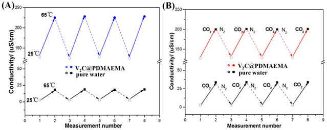 此外,V2C良好的導(dǎo)電性,使得V2C@PDMAEMA對(duì)CO2-溫度雙重響應(yīng)能夠在電導(dǎo)率更加容易地體現(xiàn)。在溫度由25℃和65℃之間轉(zhuǎn)變時(shí),V2C@PDMAEMA水溶液的電導(dǎo)率從125μS cm−1到225μS cm−1間發(fā)生可逆變化,這個(gè)變化幅度比純水要大得多(如圖3(a))。CO2和N2的交替鼓入也能使V2C@PDMAEMA水溶液的電導(dǎo)率發(fā)生可逆響應(yīng)。因此該實(shí)驗(yàn)表明通過對(duì)電導(dǎo)率的測(cè)定,V2C@PDMAEMA可以有助于監(jiān)測(cè)體系中溫度和CO2的濃度,視為一種良好的傳感器材料。