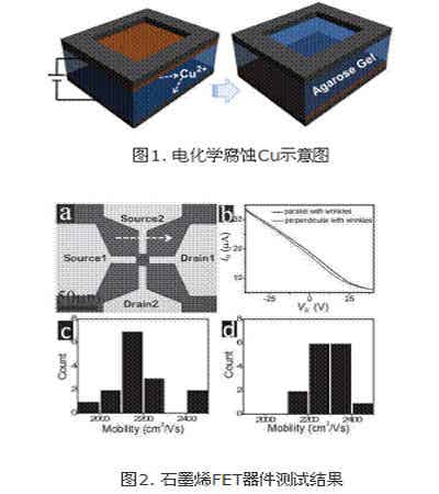 石墨烯作為一種新型的二維碳材料,由于其優(yōu)異的電學、光學性質(zhì)以及穩(wěn)定的化學特性,在微電子領(lǐng)域具有廣闊的應用前景。化學氣相沉積方法是取得高質(zhì)量石墨烯的重要途徑之一,但將石墨烯從金屬表面向目標襯底的轉(zhuǎn)移是制約該方法推廣的“瓶頸”。四室研究團隊創(chuàng)造性地采用瓊脂糖凝膠作為固體電解質(zhì),利用電化學方法實現(xiàn)了石墨烯的綠色高效轉(zhuǎn)移。該轉(zhuǎn)移方法可推廣至大尺寸石墨烯薄膜的制備,為石墨烯的大規(guī)模應用提供了可行的途徑。