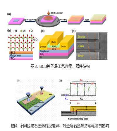 在石墨烯射頻器件的制備過程中,已有的柵介質(zhì)制備方法在工藝的可控性和器件性能方面具有一定的缺陷。四室研究團隊利用旋涂的方法在石墨烯表面形成BCB薄膜,并以此作為種子層進行了氧化鋁介電層的沉積生長。該方法不僅具有極好的工藝可控性,由于BCB特殊的化學結(jié)構(gòu),避免了對石墨烯性能的不利影響,實現(xiàn)了高性能石墨烯射頻器件的制備。