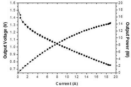 中國科學院寧波材料技術與工程研究所動力鋰電池工程實驗室在優(yōu)化陰極空氣擴散電極的結構與制備工藝,以及開發(fā)高性能的錳氧化物氧還原催化劑的基礎上,成功研制出1000Wh鎂空氣電池樣機,詳見圖1所示。該電池由5個單體電池串聯(lián)而成,以AZ31鎂合金為陽極,以10%的NaCl溶液為電解液,以上述空氣擴散電極和錳氧化物催化劑為陰極。該鎂空氣電池的外觀尺寸為200×150×150 mm3,重量為2.3 kg,能量密度可達430 Wh/kg,最大輸出功率可達80W,其單體電池的I-V曲線如圖2所示。上述鎂空氣電池具有較好的商業(yè)化前景,可應用為野外供電電源、移動電源、備用電源和應急電源等。
