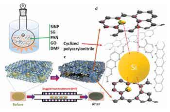 由硅納米顆粒、硫摻雜的石墨烯以及聚丙烯腈混合材料涂覆后的負(fù)極極片經(jīng)高溫處理后,硅會(huì)與周圍硫化石墨烯中的硫以共價(jià)鍵的相互作用被相對固定到一個(gè)位置,而聚丙烯腈將會(huì)進(jìn)行環(huán)化反應(yīng)形成一個(gè)含氮的穩(wěn)定六圓環(huán)結(jié)構(gòu)的石墨化碳。如此,通過熱處理,一個(gè)穩(wěn)定的原子尺度的結(jié)構(gòu)構(gòu)筑成型;其中,一方面,硅通過共價(jià)作用被以石墨烯納米片層所組成的支架所保護(hù),另一方面,石墨化的聚丙烯腈形成的網(wǎng)絡(luò)結(jié)構(gòu),進(jìn)一步加強(qiáng)了對硅穩(wěn)定的防護(hù)。