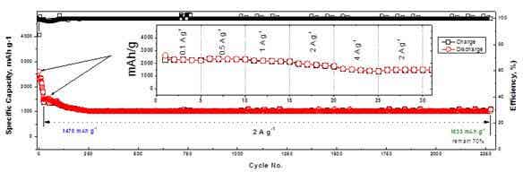 正是由于這種電極微觀結(jié)構(gòu)的構(gòu)筑成型,使得電極在充放電過程中硅的體積膨脹能夠被固定到一定的空間范圍之內(nèi),電極結(jié)構(gòu)不會(huì)被破壞,確保了電極能夠到達(dá)2000次的循環(huán)壽命;另外,此結(jié)構(gòu)體高的電子和鋰離子傳導(dǎo)性也保證了硅材料容量的正常發(fā)揮,即在0.1A g-1電流循環(huán)100次,整體電極的平均容量達(dá)到2750mAh/g-1;在更高倍率2 A g-1循環(huán)2275次,容量依然能夠保持在1000mAh/g-1以上。