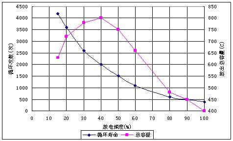 1)放出總容量與放電深度關系不同于循環壽命次數與放電深度關系,是在一定放電深度下有最大放出總容量的曲線。