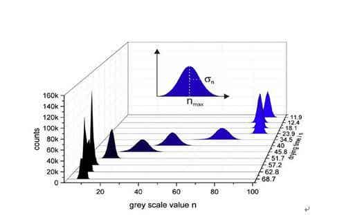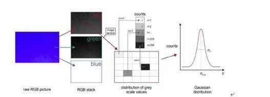 原始的RGB圖像分割成紅(red)、綠(grenn)、藍(blue)三原色,將圖像劃分為10x10個部分,計算分析每個部分細節。對像素點三原色分量灰度值進行計數,然后做成高斯分布圖,標準偏差σ和平均灰度值nmax作為圖像處理的特征量。