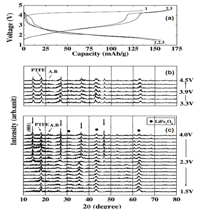 圖2 (a)LiFeO2充放電曲線(b)初次充電的原位XRD圖譜(c)初次放電的原位XRD圖譜