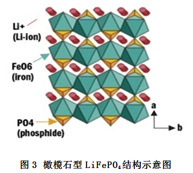 LiFePO4理論容量為170mAh×g-1,價格低廉,環境友好,無毒性,是一種非常有應用前景的正極材料,并得到了廣泛的關注,相對金屬鋰的電極電位為3.45V。具有有序的橄欖石型結構,如圖3所示,屬于正交晶系Pmnb群,每個晶胞中有四個LiFePO4單元,氧原子以近似六方密堆積,磷原子在氧四面體的4C位,鐵原子和鋰原子在氧八面體的4C和4a位,FeO6八面體在b-c平面通過共點連結起來。一個FeO6八面體和兩個LiO6八面體和一個PO4四面體共棱,Li+在4a位形成共棱的連續直線鏈并平行于C軸,這樣Li+具有二維可移動性,可以在充放電過程中自由脫出和嵌入。LiFePO4中O2-和P5+形成PO43-的聚合四面體穩定了整個三圍結構,從而使其在高溫下更穩定更安全。LiFePO4循環性能較好,充放電過程中晶體結構穩定,充放電曲線很長很平穩[17-18]。