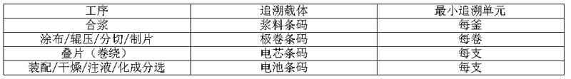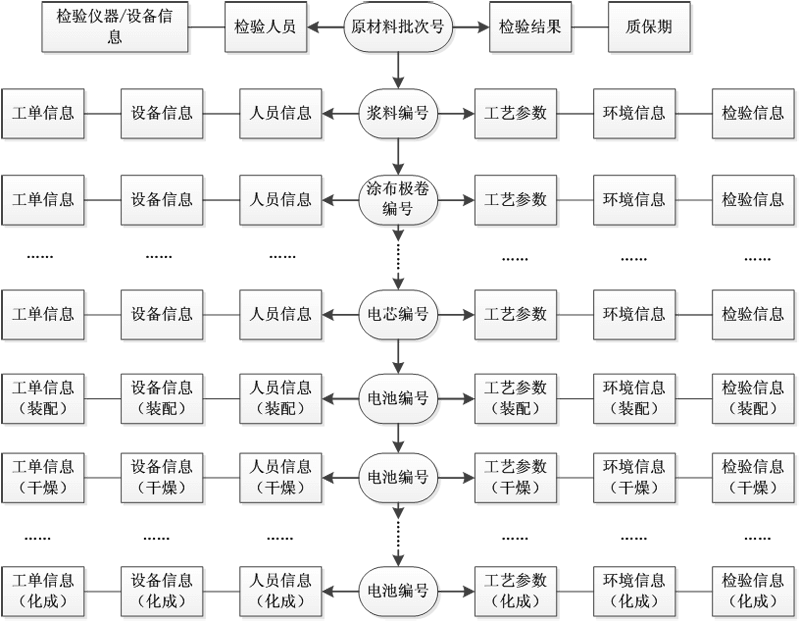 由于鋰離子電池前工序屬離散型生產、后工序屬流程型生產,且在制品分別以液態漿料、極卷、裸電芯及電池四種狀態存在,因此需要根據各工序的實際情況確定合適的追溯載體,確定追溯的最小單元,以便于記錄、區分不同工序的在制品,各工序間通過追溯載體的逐級關聯,實現整個生產過程的追溯。