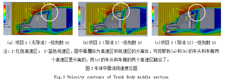 圖3是車(chē)體在流場(chǎng)中的速度分布云圖(取中面),對(duì)比三個(gè)項(xiàng)目,可清晰觀察到:項(xiàng)目1和項(xiàng)目2在車(chē)頭與車(chē)廂之間形成的兩個(gè)高速區(qū)組成的流線區(qū)是分離的,而項(xiàng)目3的兩個(gè)高速區(qū)組成的流線區(qū)幾乎是融合的。另外,云圖的顏色從藍(lán)至紅,表示空氣流速不斷增高,因此紅色區(qū)為高速區(qū),而藍(lán)色區(qū)為低速區(qū),速度發(fā)生驟變的區(qū)域稱為分離區(qū)。從圖可看到,車(chē)頭上方形成的氣流高低速分離區(qū)的形狀,無(wú)導(dǎo)流罩時(shí),駕駛室上方的流體流線軌跡形成明顯的高速與低速的分離帶,項(xiàng)目2導(dǎo)流罩由于沒(méi)有完全占據(jù)高速與低速的分離帶,仍不符合流線軌跡,因此項(xiàng)目2的兩個(gè)高速區(qū)仍是分離狀態(tài),項(xiàng)目3導(dǎo)流罩幾乎完全占據(jù)了高速與低速的分離帶,外形從設(shè)計(jì)上也幾乎符合了流線軌跡,因此,項(xiàng)目3的兩個(gè)高速區(qū)幾乎融合在一起。